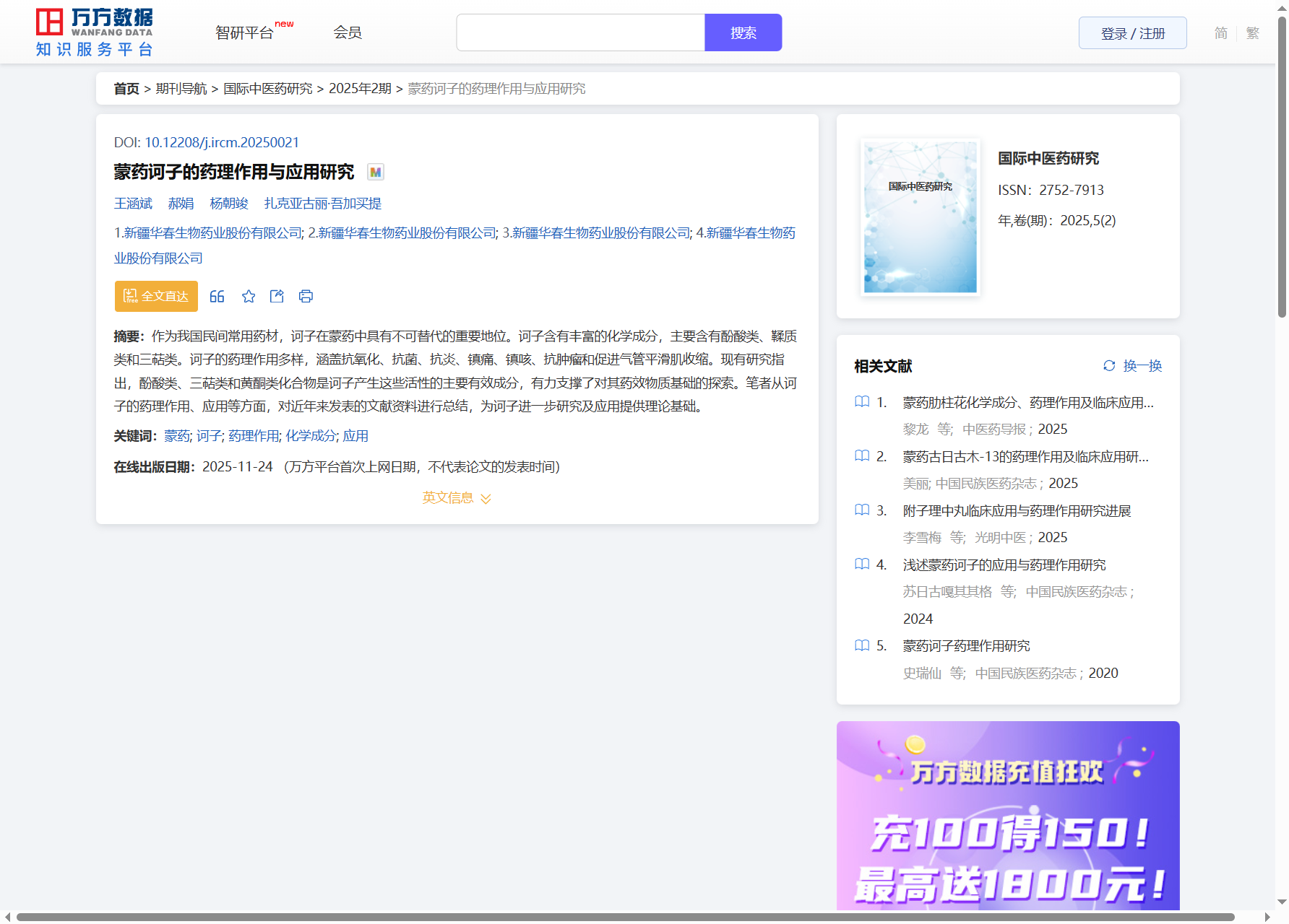 关键词: 蒙药;诃子;药理作用;化学成分;应用