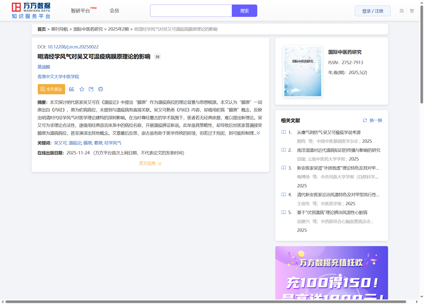 莫迪麟, 明清经学风气对吴又可温疫病膜原理论的影响[J]. 国际中医药研究, 2025; 5: (2) : 40-43.